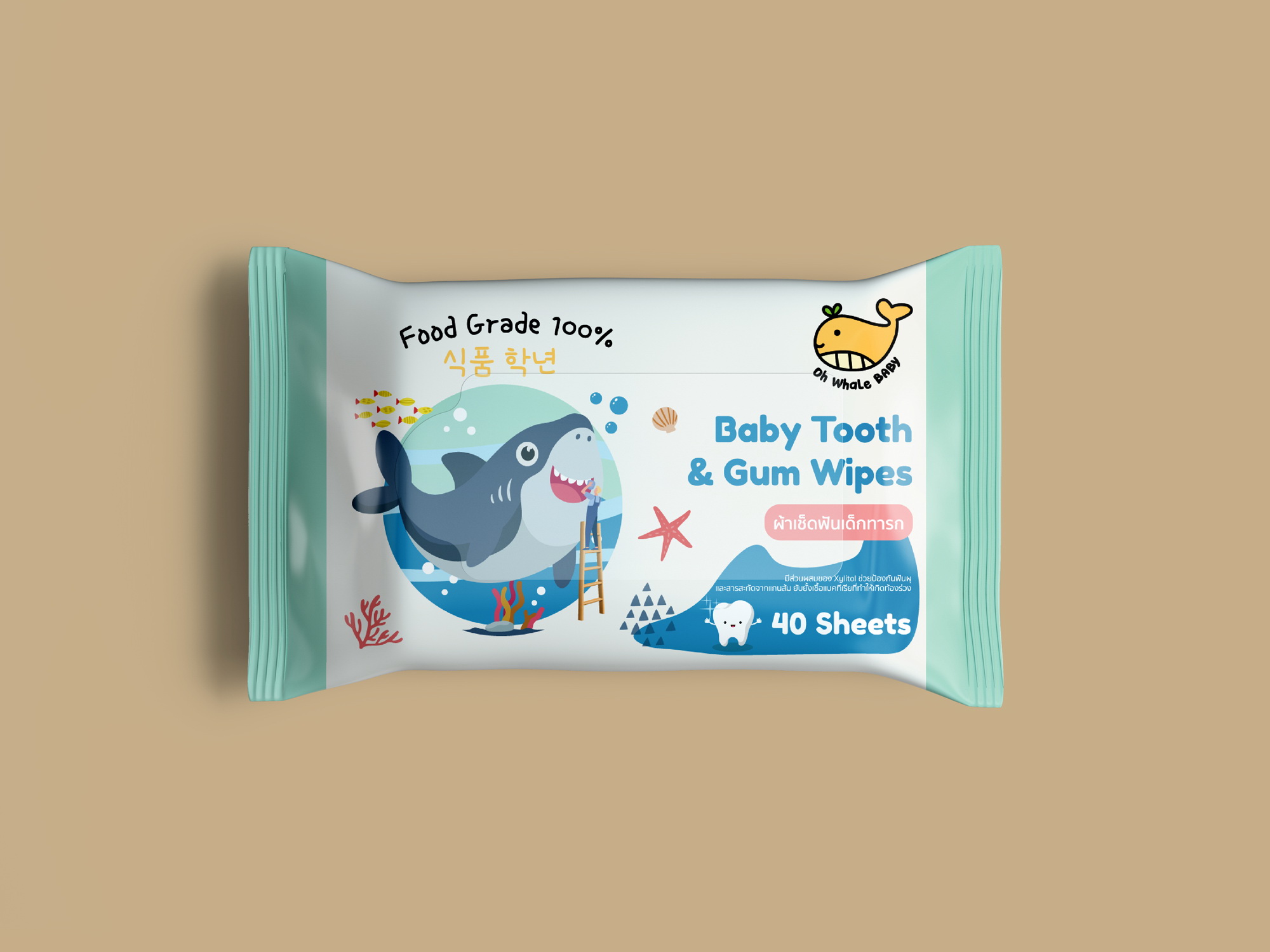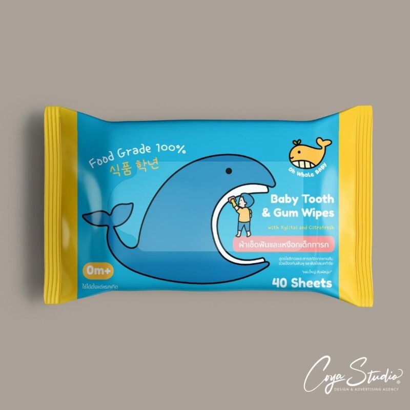 ผลงานออกแบบแพ็คเกจจิ้งทิชชู่เปียกสำหรับเช็ดฟันและเหงือกเด็กทารก จากแบรนด์ Oh Whale โจทย์ยากคือจะทำอย่างไรให้ลูกค้าทราบว่านี้คือกระดาษทิชชู่เปียกสำหรับเช็ดฟัน ไม่ใช่ทิชชู่เปียกธรรมดา เราจึงใช้ภาพปลาวาฬอ้าปากขนาดใหญ่ และเด็กกำลังเช็ดฟันปลาวาฬอยู่ ซึ่งสอดคล้องกับแบรนด์ที่เน้นรูปปลาวาฬเป็นหลัก นอกจากนี้เรายังเพิ่มลูกเล่นเล็กๆ เช่น ภาษาเกาหลี Food Grade หรือสัญลักษณ์ที่สื่อว่าใช้ได้ตั้งแต่เด็กแรกเกิดอีกด้วย